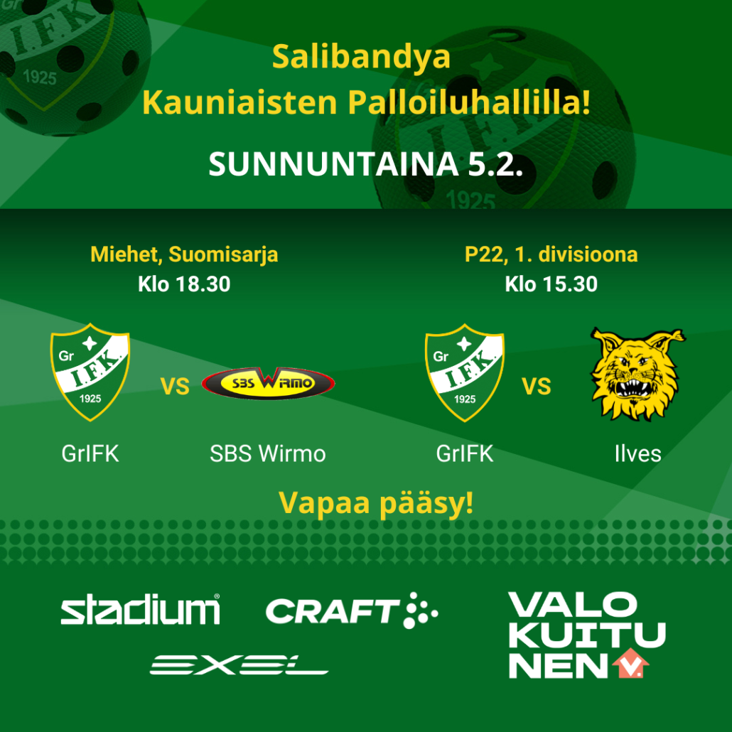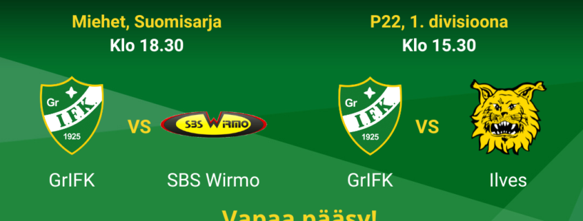 Klo 18.30 isketään yhteen miesten Suomisarjan ottelussa, kun Grani toivottaa tervetulleeksi vierasjoukkue SBS Wirmon. Wirmo pitää tällä hetkellä hallussaan Divarikarsintoihin oikeuttavaa sarjataulukon toista sijaa, joten edustusjoukkueellamme on edessä tiukka vastus. Lokakuun ensimmäisessä kohtaamisessa Mynämäellä joukkueet kuitenkin tahkosivat kaksi erää aivan rinta rinnan, joten jännittäviltä vaiheilta tuskin sunnuntai-iltanakaan vältytään.
