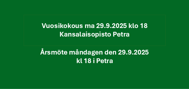 Seuran sääntömääräinen vuosikokous pidetään maanantaina 29.9.2025 klo 18 Kansalaisopisto Petrassa. Asialistalla sääntömääräiset asiat. Tervetuloa!